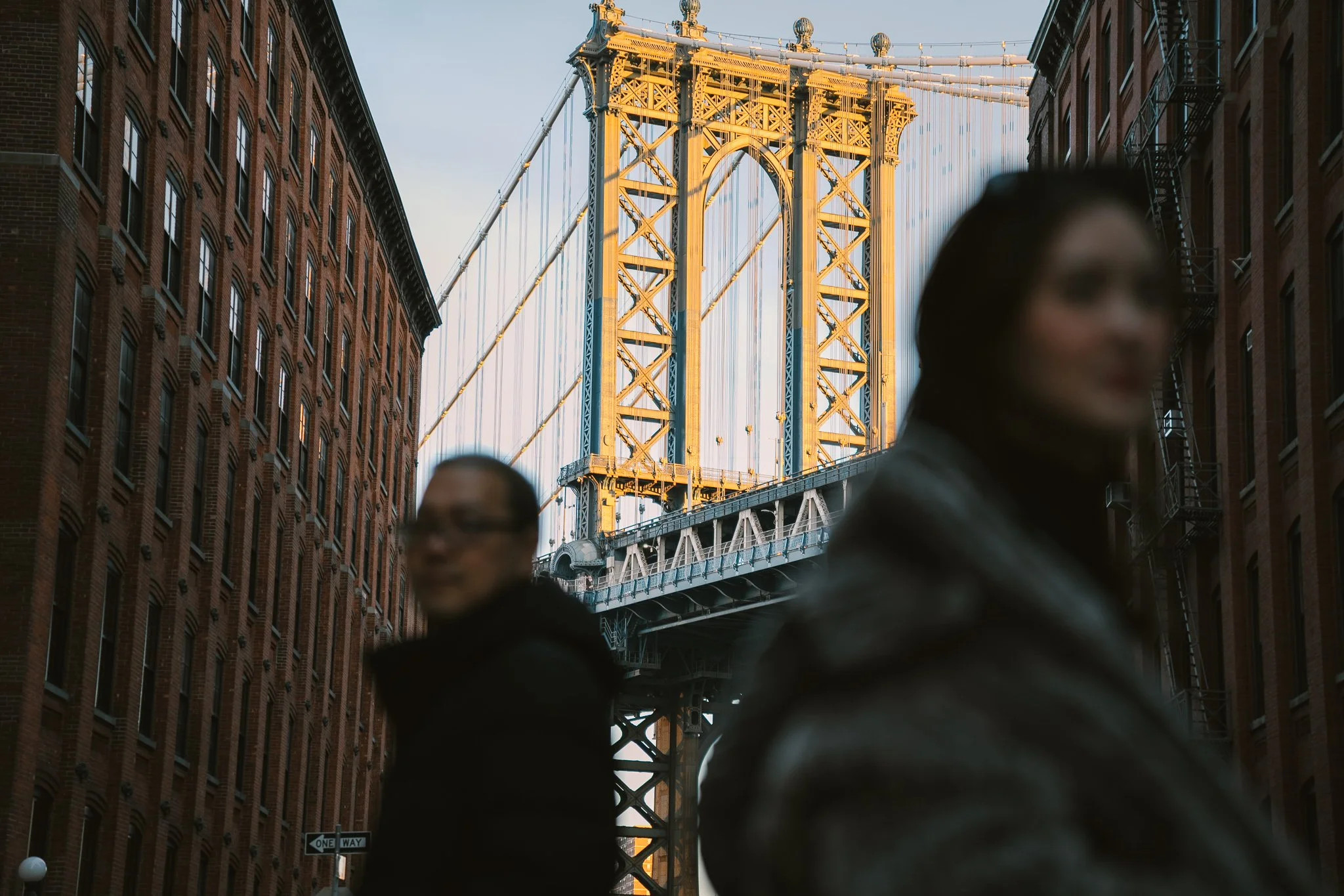 The corner of Washington Street and Front Street is one of the most requested frames in all of New York City wedding, engagement & elopement photography — and for good reason. The Manhattan Bridge fills the gap between the buildings like a painting hanging on a brick wall. Beyond that famous shot, DUMBO rewards exploration: rain-slicked cobblestones, weathered warehouses, and sweeping East River views from Brooklyn Bridge Park make this neighborhood endlessly versatile.